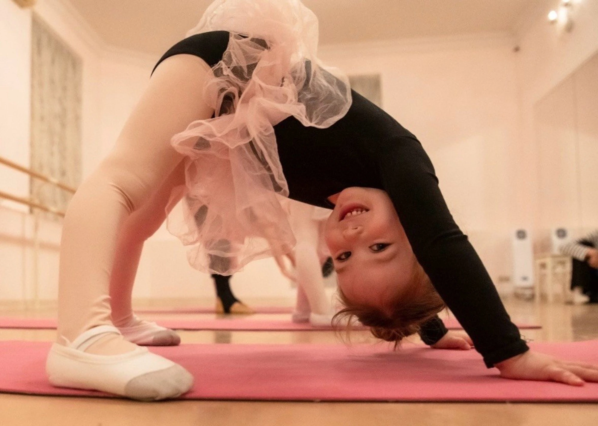Каждое занятие обязательно включает в себя специальную гимнастику, которая укрепляет необходимые в балете группы мышц, улучшает растяжку и гибкость.