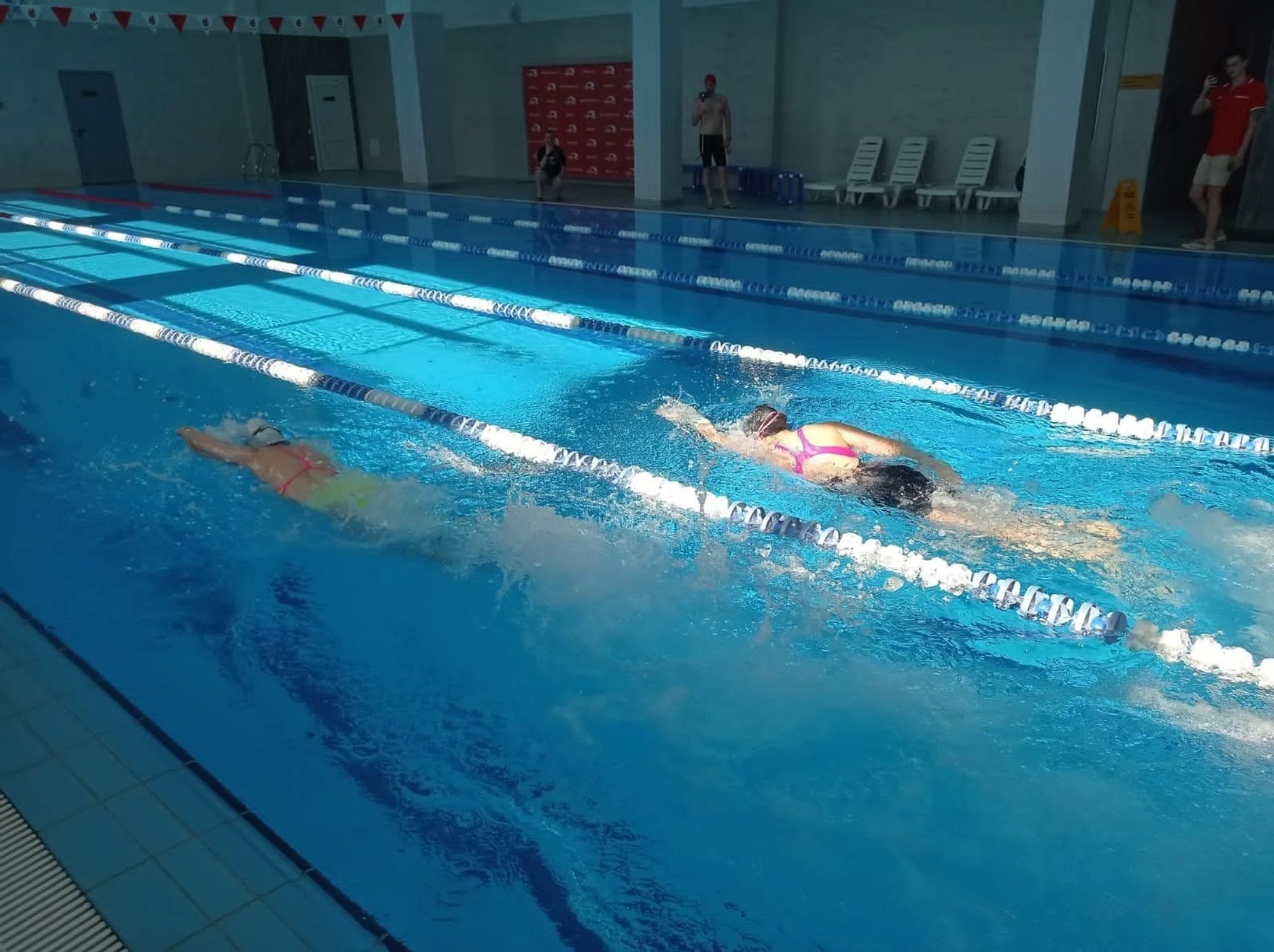 - Большая аква-зона с бассейном 25 м - 5 дорожек для свободного плавания, которые никогда НЕ БУДУТ ЗАНЯТЫ групповыми программами, потому что дополнительно для них организован бассейн 12 * 12 метров для аква-аэробики различной направленности (групповые программы водного комплекса; различные реабилитационные программы).